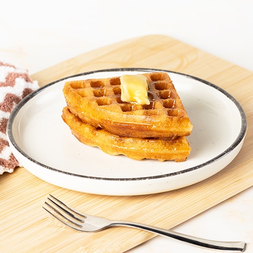 Crisp waffle topped with smooth maple syrup and a pat of melting butter for a rich, homely indulgence.